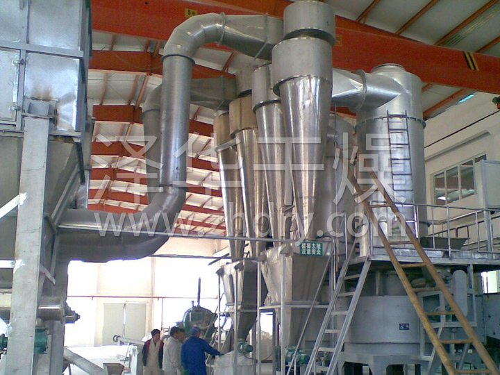 流化床干燥機(jī)是由物料自進(jìn)料進(jìn)口進(jìn)入機(jī)內(nèi),在振動(dòng)力作用下,物料沿水平面流化床拋擲,向前連續(xù)運(yùn)動(dòng),熱風(fēng)向上穿過(guò)流化床同濕物料換熱后,濕空氣經(jīng)旋風(fēng)